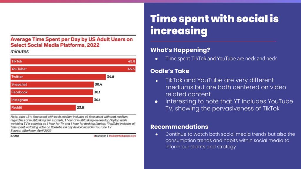 US adult users are spending more time on social media platforms: US adult users average 45 minutes per day on both TikTok and YouTube.Social video ads are getting shorter in length: In 2022, dominant ad formats on social platforms ranged from 3-15 seconds. Connected TV and Linear TV have shown results with dominant ad formats ranging from 15-30 seconds.