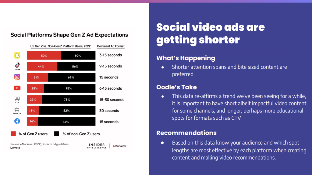 Shorter attention spans mean that video ads with shorter formats are seeing better results. The latest data from Insider Intelligence continues to show a trend Oodle has observed over the past 2+ years: short and impactful video content for social platforms is showing increased results compared to tests with longer ad formats. Longer formats still perform well for educational spots on formats like linear TV and connected TV (CTV)